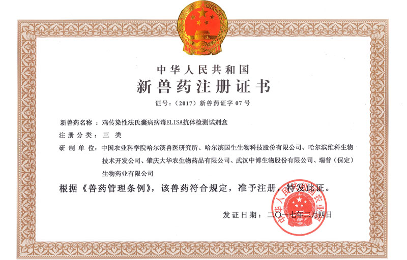 2017年2月4日,農業部發布第2490號公告,由中國農業科學院哈爾濱獸醫研究所(以下簡稱哈獸研)、哈爾濱國生生物科技股份有限公司(動物用生物制品國家工程研究中心,以下簡稱國生生物)、哈爾濱維科生物技術開發公司、肇慶大華農生物制品有限公司、武漢中博生物股份有限公司和瑞普(保定)生物藥業有限公司6家單位聯合研發的雞傳染性法氏囊病病毒ELISA抗體檢測試劑盒,獲批新獸藥注冊證書(2017新獸藥證字07號)。該產品由哈獸研王笑梅研究員為首席科學家的禽免疫抑制病團隊研制,由國生生物承擔相關孵化工作。